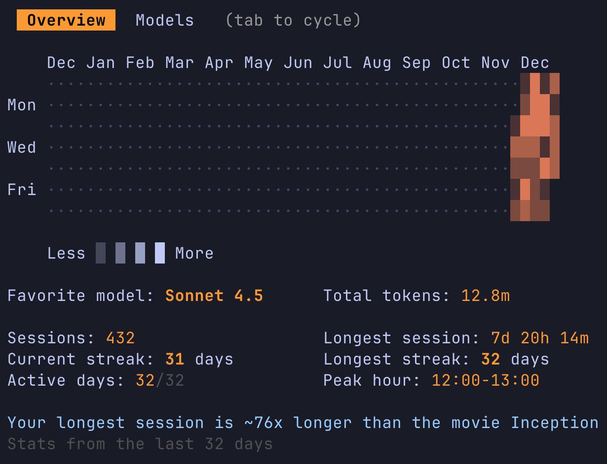 Claude Code now has a /stats command to see how much you've been torturing it lately.